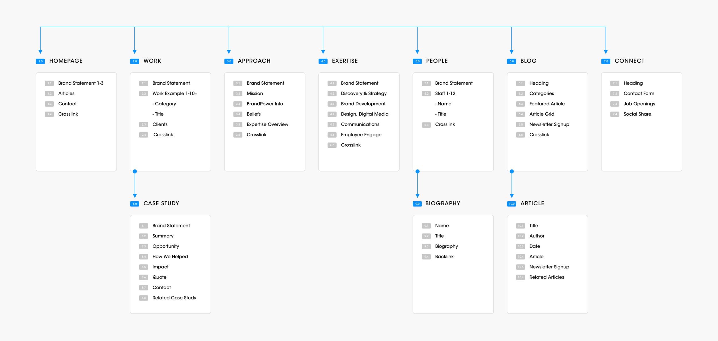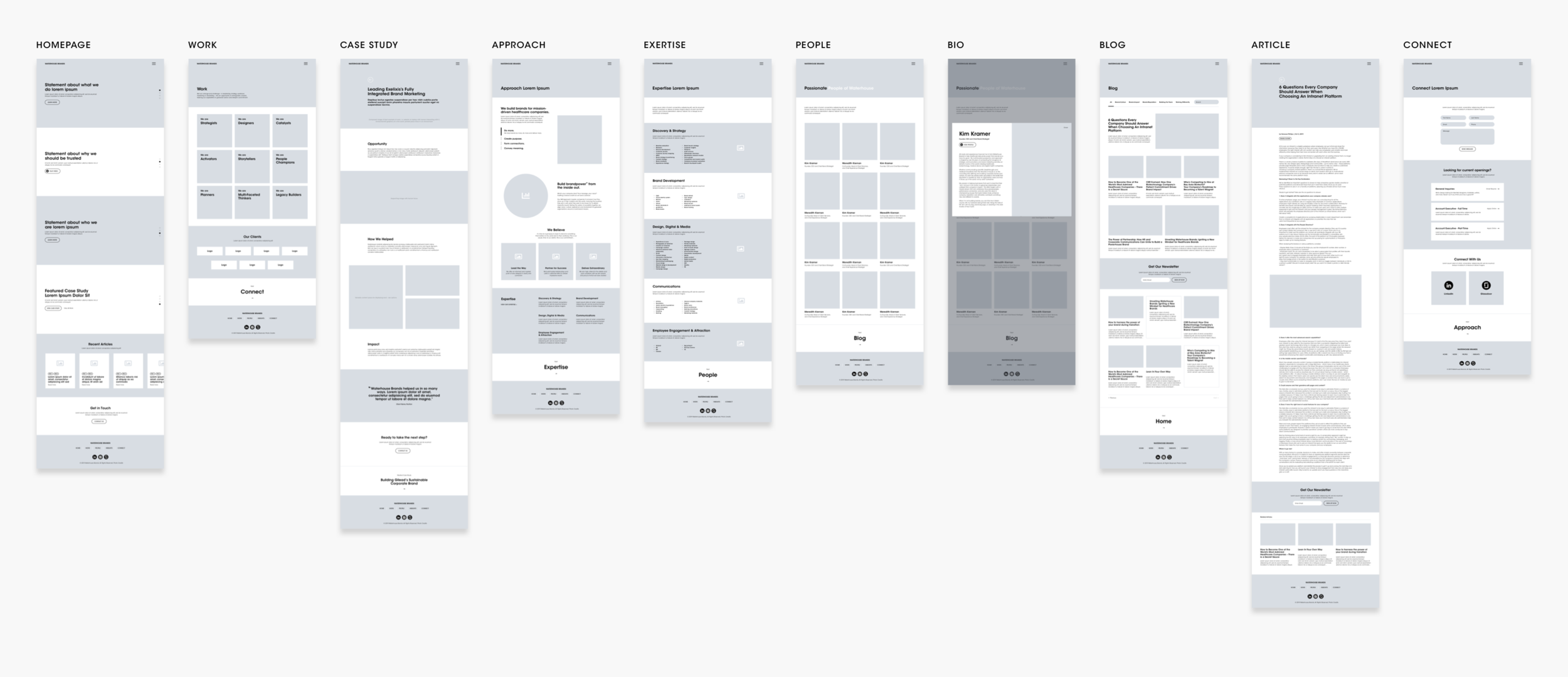 As with all my website projects, I started by creating a simple site map with a breakdown of the different content pieces on each page. This allowed the folks at Waterhouse to begin writing towards the identified areas while offering guidance on the site’s wireframes.